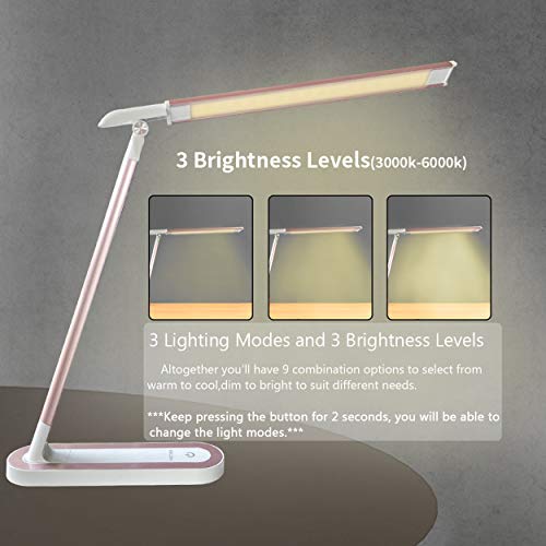 HDTIME-Desk Lamp with USB Charging Port, 3 Lighting Modes 3 Brightness Levels Desk Light,Touch Control Adjustable Led Kids Desk Lamp Pink for Reading,Study,Office