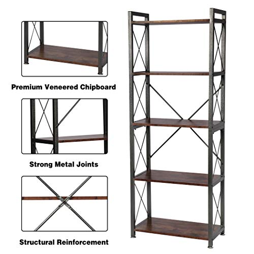 LAVIEVERT 5 Tier Industrial Bookshelf Vintage Bookcase Shelf Organizer Rustic Wood and Metal Storage Rack for Home, Office, Garage, Kitchen, Living Room – Rustic Brown